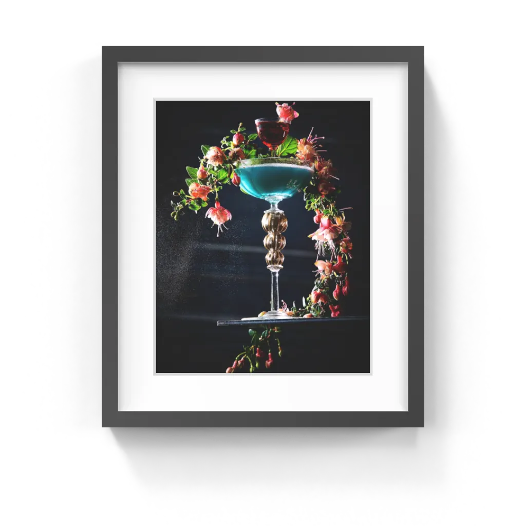 This stunning cocktail has a sash of beautiful flowers that dramatically drape over the glass, with a delicate mist. All prints include a Certificate Of Authenticity, signed by the artists, Chriscilla and Daniel.